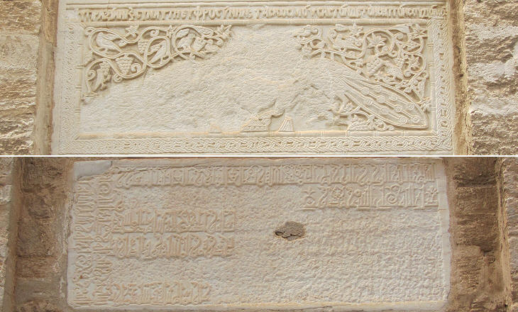 Great Mosque: (above) early Christian relief which portrayed two peacocks (symbols of resurrection) placed front to front; (below) Kufic inscription