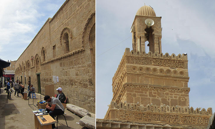The Great Mosque of Sfax was enlarged in the XIXth century, but its eastern side retains the original design of the XIth century. The minaret has three levels, similar to that of Kairouan, but it has a gentler aspect owing to an elaborate decoration and Kufic inscriptions.