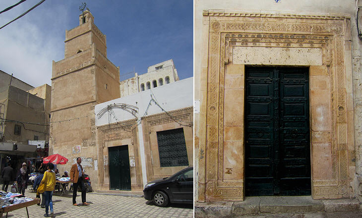 A pink/yellowish stone from Gabes, a town south of Sfax, has been employed in many buildings of the medina. The stone can be carved to obtain elaborate and lasting decorations. The image used as background for this page shows a section of a portal made with this stone.