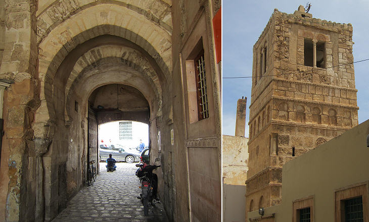 (left) A vaulted passage having an ancient column on the left; (right) minaret of Sidi Ammar Kammoun Mosque (XVIIth century)
