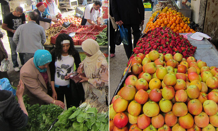 Only one or two per cent of the current population of Sfax lives in the medina, but the traditional fruit and vegetable market which is held near the gate which gave access to the countryside is still very popular. The photo was taken at the end of April 2012 and strawberries were already ripe.