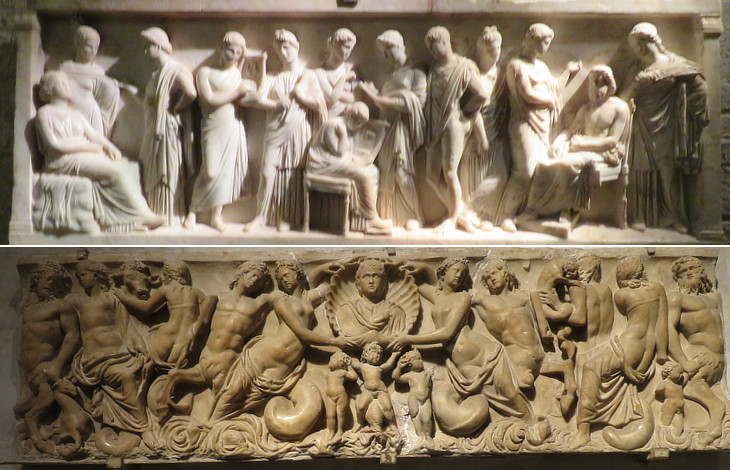 (above) "Muse Chigiane", it most likely depicts the poetess Sappho being greeted by the Muses (IInd century AD); (below) Museo dell'Opera del Duomo: sarcophagus from the sacristy of the Cathedral depicting a sea thiasos, a Dyonisiac procession of mermaids and tritons (see a list of similar sarcophagi in Rome)