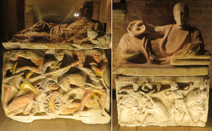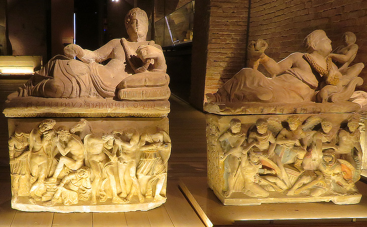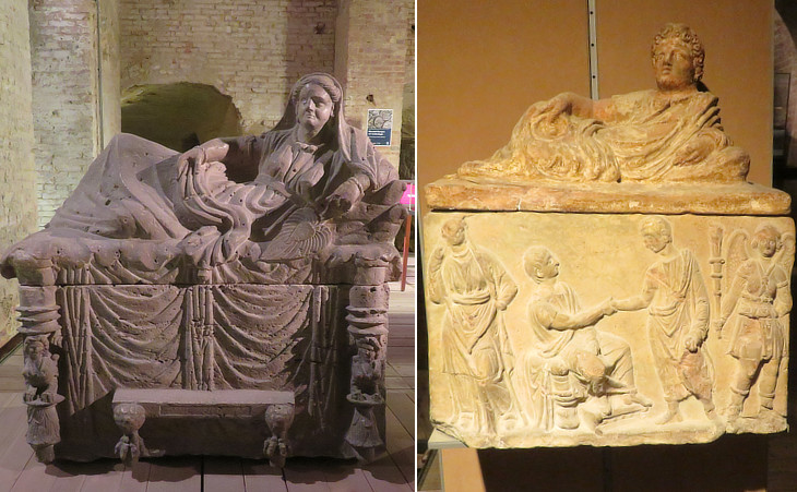 Travertine urn from Perugia with the box having the shape of a "kline", a funerary bed (see some exhibits of the Archaeological Museum of Perugia); (right) urn from Chiusi which belonged to an academy of Siena: the box depicts a man taking leave while Vanth, a female demon with a torch is waiting for him (see a similar scene in a tomb at Tarquinia)