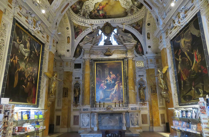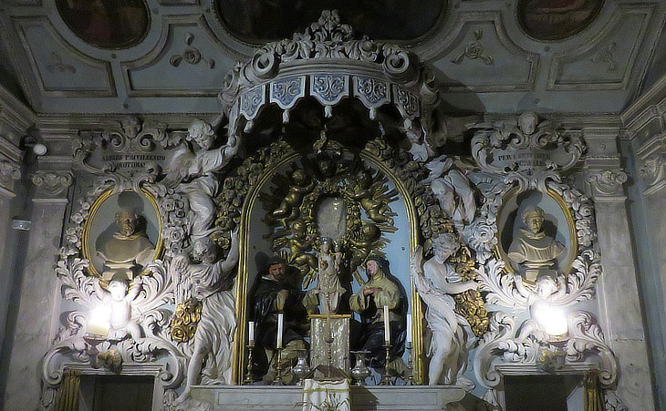 In the early XVIIIth century, the oratory was richly embellished with stuccoes and paintings. The altar houses a XIVth century marble Madonna, likely the oldest devotional image venerated by the brotherhood, between Sts. Dominic and Catherine in adoration. The statues are attributed to Giovanni Antonio Mazzuoli, a pupil of Gian Lorenzo Bernini.