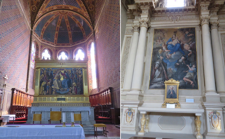 S. Clemente in S. Maria dei Servi: (left) Apse with main altar and a Coronation of Mary by Bernardino Fungai (1501); (right) Madonna and Child with St. Philip Neri and St. Giuliana Falconieri, niece of Alessio Falconieri, by Giuseppe Nicola Nasini (before 1736)