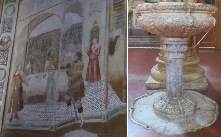 S. Clemente in S. Maria dei Servi: (left) Decollation of St. John the Baptist by Pietro Lorenzetti; (right) holy water basin (partly XIIIth century and almost identical to one at S. Francesco)