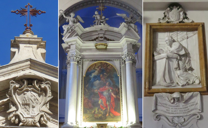 S. Giorgio: (left) top of the façade with the coat of arms of Cardinal Antonio Felice Zondadari seniore and behind it the Cross of Malta; (centre) main altar with a painting portraying St. George by Sebastiano Conca, a leading Roman painter; (right) monument to Alessandro Zondadari, Archbishop of Siena