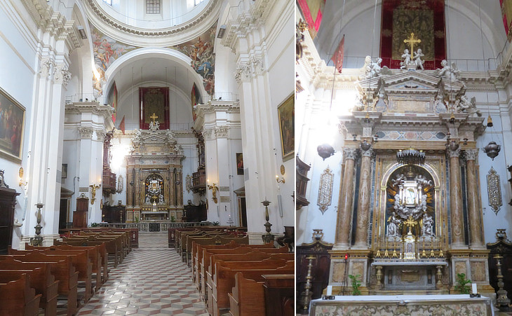 S. Giorgio: (left) façade; (right) interior with the flags of the Contrade (they can be seen in several other churches, e.g. S. Domenico)