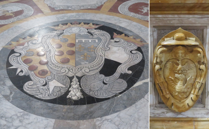 S. Maria di Provenzano - coats of arms: (left) C.o.a. of Grand Duke Cosimo III and his wife Marguerite Louise of Orleans between those of Francesco Maria de' Medici and of the City of Siena; (right) Archbishop of Siena Camillo Borghese (cousin and namesake of Pope Paul V)