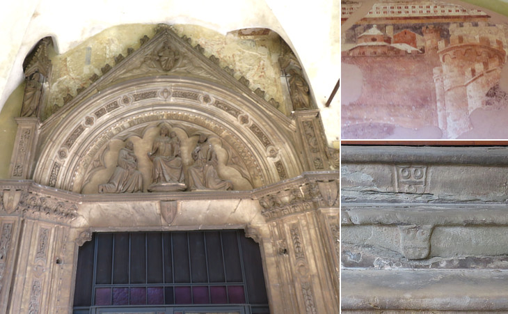Cloister: (left) Gothic portal of the Petroni chapel by Agnolo di Ventura, a sculptor who worked at the Monument to Bishop Tarlati in Arezzo; (right-above) fragment of a fresco by Ambrogio Lorenzetti; (right-below) steps leading to the church