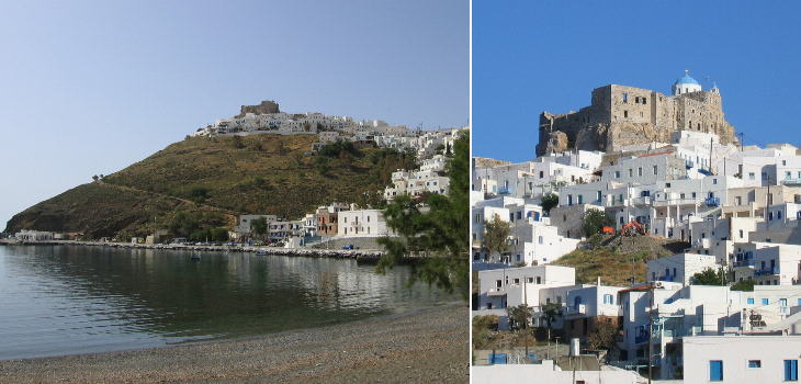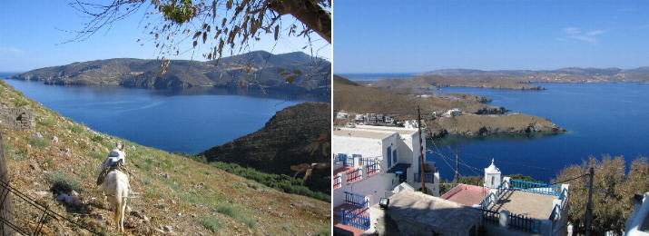 The main town of Stampalia is located on the top of a hill allowing a view over two small coves and over the narrow isthmus (less than 50 yards) which links the two parts of the island. If Stampalia