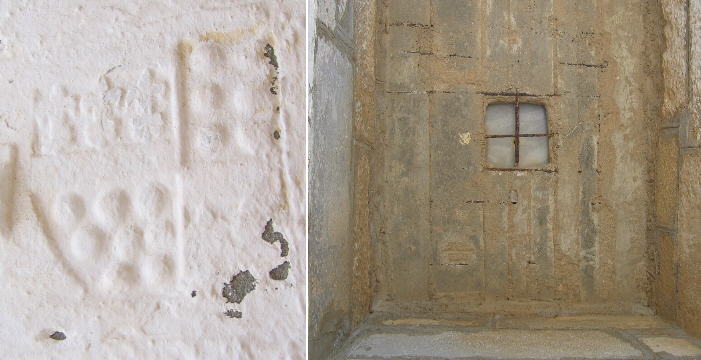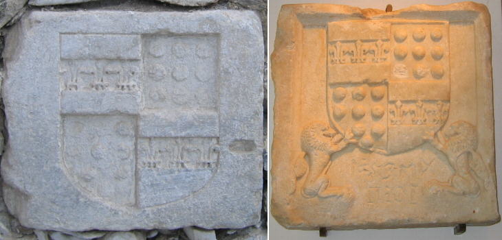 Entrance to the castle: (left) coat of arms of the Querini; (right) small opening on its ceiling; the image used as background for this page shows a detail of another coat of arms