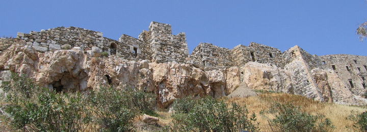 The promontory is capped by a steep rock accessible only from one side; this acropolis is now occupied by the castle, whose entrance yet bears the arms of the Quirini, while inside it there still exists the inscription of Giovanni Quirini, its builder. Dawkins & Wace