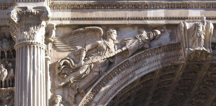 Arco di Settimio Severo: detail of the western side portraying a Victory holding a military trophy. The inscription celebrates the Emperor as Parthico Arabico and Parthico Adiabenico