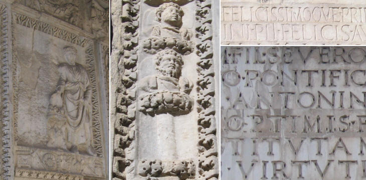 removed; (right) inscriptions on the same arch (first line) and in Arco di Settimio Severo (fourth line)