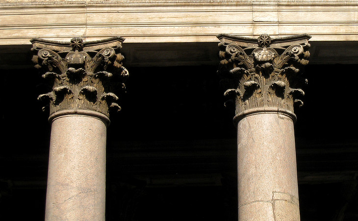 Two columns of the portico of the Pantheon which were added by Gian Lorenzo Bernini in 1660 and which came from "Thermae Alexandrinae"; they bear one of the heraldic symbols of Pope Alexander VII