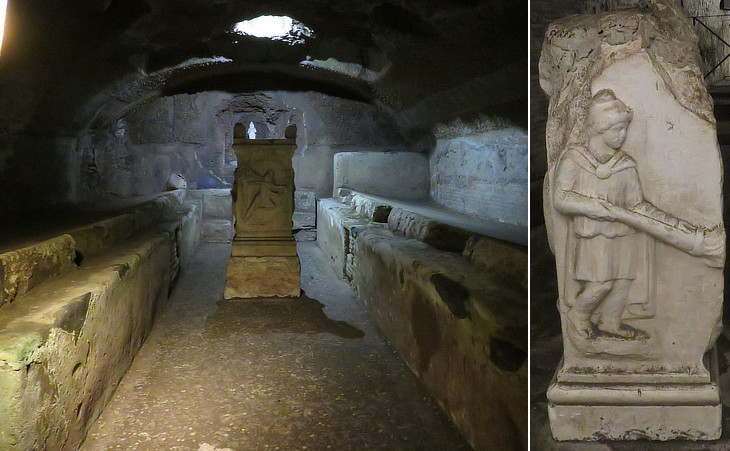 Mithraeum of S. Clemente: altar to the god and relief on one of its sides portraying Cautopates, a torch bearer holding his torch down; together with Cautes, another torch bearer, he indicated the rise and fall of the sun and more in general the cycle of life