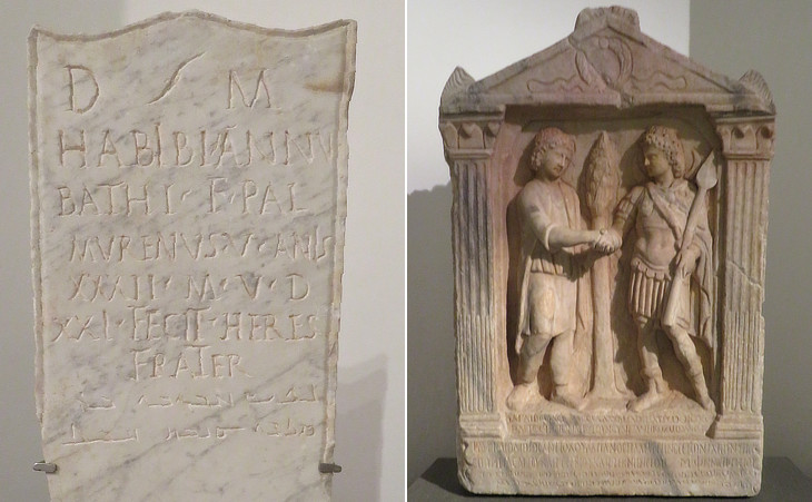 Musei Capitolini: inscriptions related to citizens from Palmyra in Syria who lived in Rome, both with small Palmyrene inscriptions: (left) gravestone of Habib (IInd century AD): (right) altar to the gods Malakbel (Sun) and Aglibol (Moon) (235 AD) (from Villa Giustiniani); see other eastern reliefs showing gods shaking hands