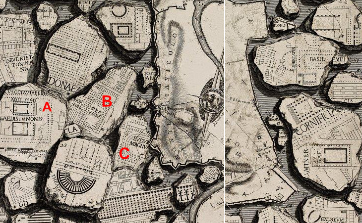 Giovanni Battista Piranesi: details of the frontispice of "Le Antichità Romane"(1756) showing fragments of "Forma Urbis Severiana", a marble plan of Rome at the time of Emperor Septimius Severus which was affixed at Tempio della Pace: A) Temples to Jupiter and Juno; B) warehouses at Testaccio; C) Ludus Magnus