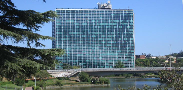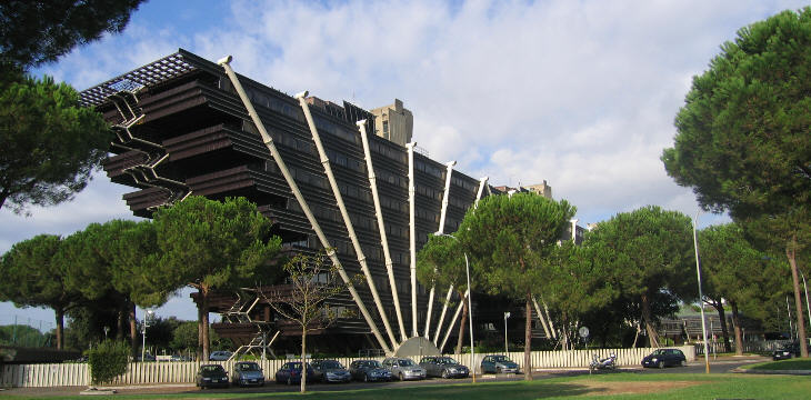 According to many Romans it is the strangest building of Rome. One of the explanations given for its unusual shape is that because the area was marshy, foundations needed to be very deep. The design chosen required this to occur on a very limited area (the three pillars supporting the gigantic "fans"). Certainly it is the most interesting building of a new business district which was developed in the late 1970s near Castello della Magliana, a Renaissance papal hunting lodge on the right bank of the Tiber. The building was designed by Julio Lafuente and Gaetano Rebecchini. Many travellers may have noticed it because it is next to the motorway linking the airport with Rome.