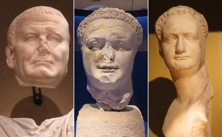 Portraits of the Flavian emperors: (left) Vespasian (Kunsthistorisches Museum - Vienna) from Salona - see him in other portraits in the Farnese Collection and at Museo Nazionale Romano; (centre) Titus (Arch. Museum - Naples) colossal head found in 1873 during the construction of Ministero delle Finanze - see another portrait of him at Chieti; (right) Domitian (Musei Capitolini) found in 1898 on the Esquiline Hill - see another portrait of him at Ephesus