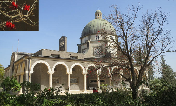 Church of the Beatitudes (see its dome in the image used as background for this page); (inset) detail of the flowers of the tree in the foreground, Erythrina Crista-Galli or Cockspur Coral Tree
