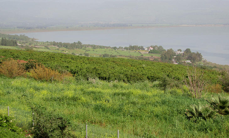 View towards the Lake of Tiberias with the Church of the Primacy of Peter on the right