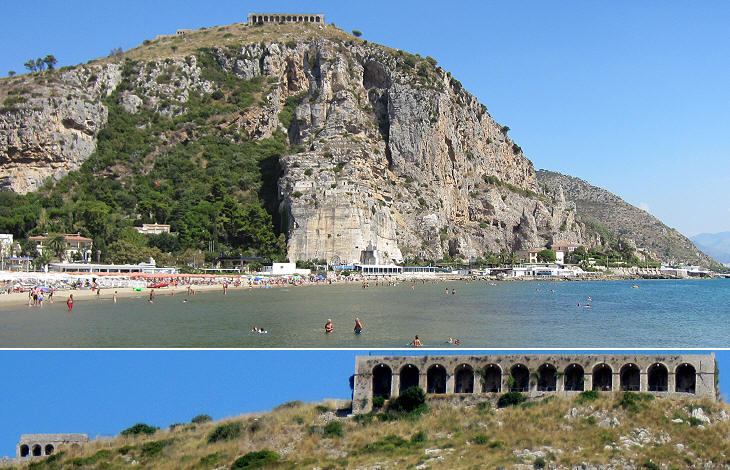 (left) Pisco Montano and Porta Napoletana seen from the road to Naples; (right) the side of Pisco Montano which was cut. You may wish to see Pisco Montano from Grotta di Tiberio at Sperlonga