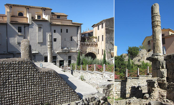 (left) Rear side of the cathedral showing parts of the Temple to Rome and Augustus; (right) Via Appia in Foro Emiliano, now the main square of Terracina