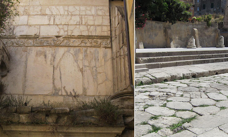Capitolium: (left) view showing a wall in "opus reticulatum"; in the background the right side of the cathedral with an ancient column; (right) column of the temple to the Capitoline