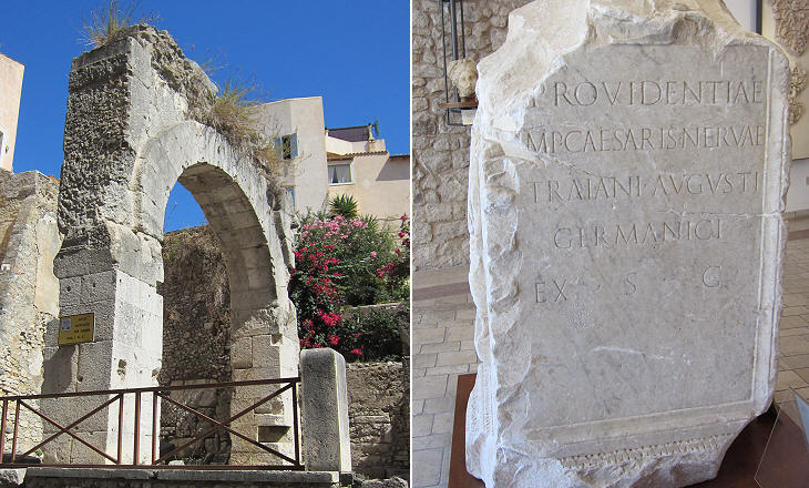 (left) Triumphal arch at the southern entrance to Foro Emiliano; (right) dedicatory inscription to Emperor Trajan celebrating his many actions