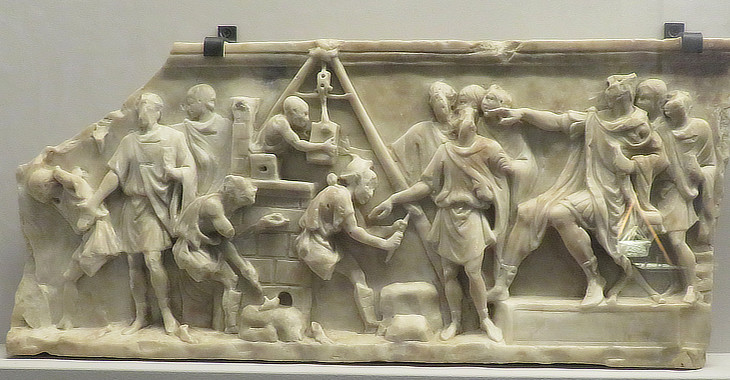 Museo Nazionale Romano: relief found at Terracina depicting construction activities and perhaps Trajan watching them