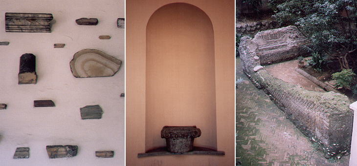 Fragments of Roman stones, capitals, Roman walls in the halls and