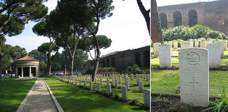 Many foreign travellers visit the Protestant Cemetery of Rome in Testaccio attracted by the accounts written by Boswell, Goethe, Henry James, Howells and others. Few of them know that across the street some 500 soldiers and officers belonging to the countries of the British Commonwealth rest in peace. They were buried in a piece of land next to the ancient walls, which was donated by the City of Rome. Approximately 50,000 Commonwealth soldiers fell in the WWII Campaign of Italy.