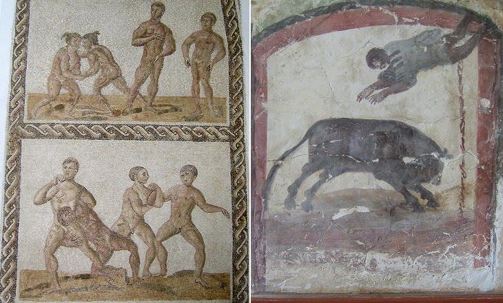 Museum of Sfax: (left) Wrestlers with the pig-tail hairstyle which was typical of Roman athletes of the IIIrd century (see similar mosaics at Dion and at the Baths or Caracalla in Rome); (right) fresco on a tomb showing a scene of bullfighting (or perhaps a bull-leaping exercise)