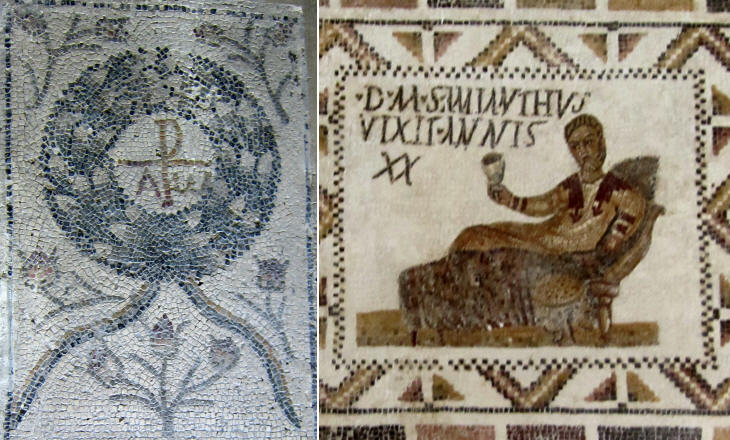 (left) A mosaic depicting a Chi-Rho, Christ's monogram on a tombstone; (right) the dead, a Pagan, attending his funerary banquet, a popular subject in tomb paintings and sarcophagi, less so in mosaics