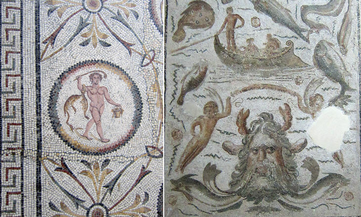 (left) Detail of a mosaic portraying a follower of Dionysus; (right) sea creatures surrounding a head of Oceanus, a very popular subject, e.g. at Sousse and at Utica