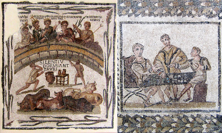 Mosaics from Thysdrus at the Museum of Bardo: (left) bulls in the arena; (right) detail of a larger mosaic known as the Cryptogram Chessboard showing dice players