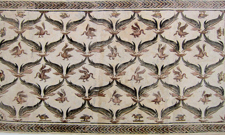 Decorative mosaic with dolphins and swans; its geometric pattern can be noticed also in a mosaic at the Archaeological Museum of Sousse