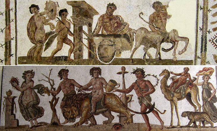 Movies and TV serials have made two aspects of Roman life very popular: gladiatorial fights and indiscriminate sexual activity. Many mosaics found throughout the Roman Empire and portraying Dionysus surrounded by satyrs and maenads may have contributed to the latter. The meaning of these mosaics was rather complex and not limited to sexual aspects. The sound of the tambourines chased evil spirits away. Playing music, drinking and laughing were ways by which the ancient Greek and Romans faced the fact that Yet we mortals bear per-force what the gods send us, though we be grieved; for a yoke is set upon our necks. Hymn to Demeter - translated by Hugh G. Evelyn-White. This explains why they were so often depicted on sarcophagi, e.g. at Lyon.