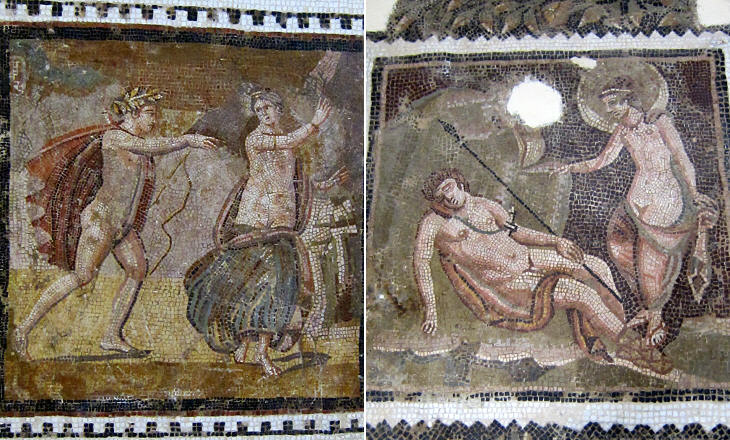 Central sections of mosaics: Greek myths made popular by Ovid's Metamorphoses: (left) Apollo and Daphne (see Gian Lorenzo Bernini's statues); (right) Selene and Endymion, a subject often depicted on sarcophagi