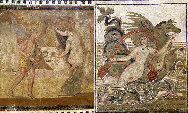 Central sections of mosaics: (left) satyr frightening a bacchant, both followers of Dionysus/Bacchus; (right) a Nereid, a sea nymph, a very popular subject: see mosaics at the Museum of Bardo in Tunis and at Hippo Regius in Algeria