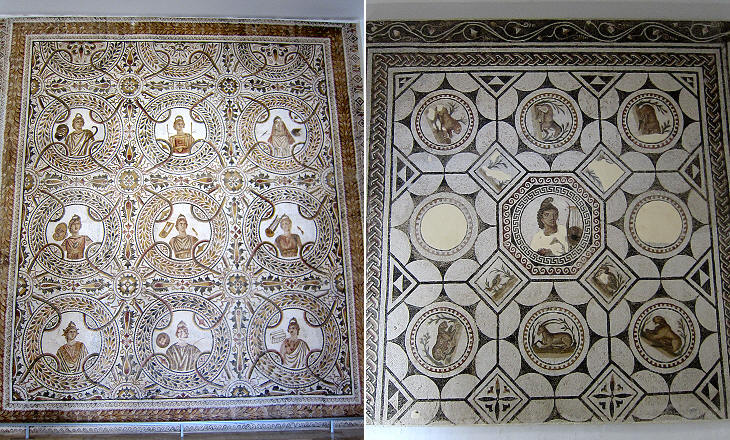 Large mosaics: (left) The Nine Muses; (right) Orpheus taming the beasts