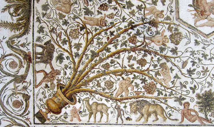 This jar was a symbol of Dionysus. It was usually depicted with a grapevine growing from it, as in some Roman baths along Via Appia. It was adopted by the early Christians as a symbol of life in mosaics at Sufetula, Uppenna and Sousse. The same subject can be seen also at S. Costanza in Rome.