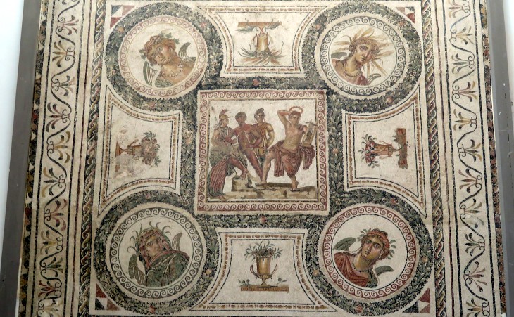 The Four Seasons distributed around a central image were a very popular subject to create a mosaic with five focal points (see a famous example at the Museum of Bardo).