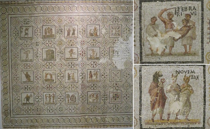 The Twelve Months of the Year were usually depicted as the Signs of the Zodiac, together with other periods of time, i.e. the Days of the Week at Ziqua or the Four Seasons at Sepphoris. This mosaic is a rare example (with a much later mosaic from Carthage) where the months of the year are depicted as such. The panel of February shows a metaphoric rite of fertility with a man hitting a woman in labor, February being the month preceding Spring. That of November shows Hermanubis, a god who combined Egyptian Anubis with Roman Mercury and two priests of Isis, a reference to the festival of Isis which ended on November 3.
