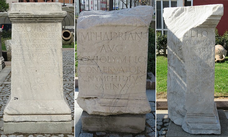 Latin inscriptions mentioning Roman Emperors: (left) from Alexandria Troas (Nerva); (centre) from Alexandria Troas (Hadrian); (right) provenance unknown (Commodus)
