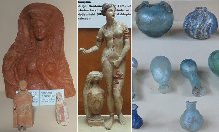 (left) Aphrodite (IVth century BC) from Tenedo; (centre) Aphrodite (from an original by Praxiteles, aka Capitoline Venus) from the Dardanos Tumulus, very near Çanakkale (IIIrd century BC); (right) glass bottles from Hamaxitus, a port not far from Assos