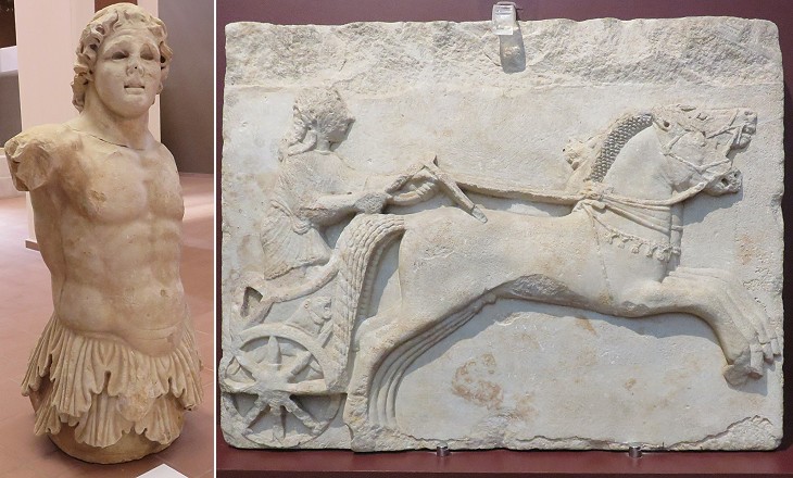 (left) Triton found at Parion, a port on the southern shore of the Dardanelles, near their eastern end; (right) relief portraying a charioteer (VIth century BC) from Cyzicus, a port on the southern shore of the Sea of Marmara (from the Archaeological Museum of Istanbul)