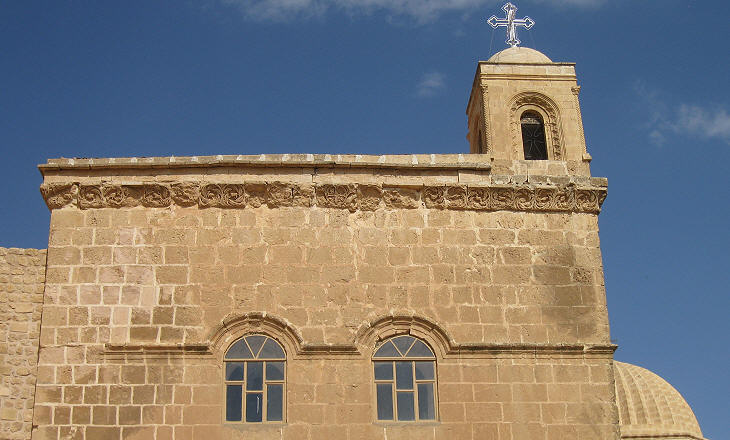 Many of the oldest churches of Rome, e.g. S. Clemente, were built above the small halls where the worshippers of the god Mithra met for their ceremonies as if to erase the memory of that cult. Similarly the monastery of Deyr az Zafaran was built in the IVth century above a temple dedicated to the Sun: it faced eastwards so that the worshippers could see the first rays of the rising sun illuminate the room. Some elements of that temple were probably employed in the decoration of the monastery.